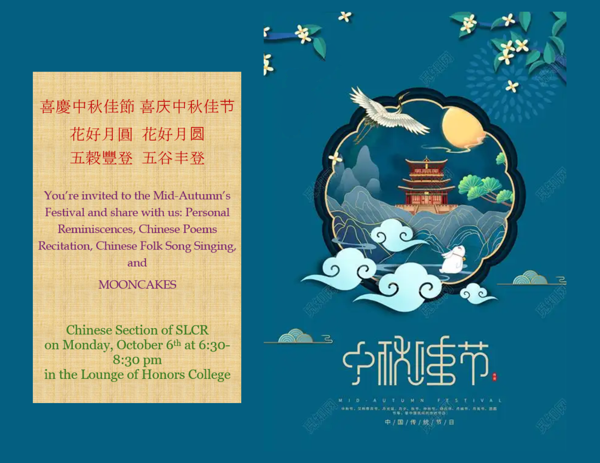 Moon cakes, pizza, Chinese snacks, chocolate coins and beverages will be served.